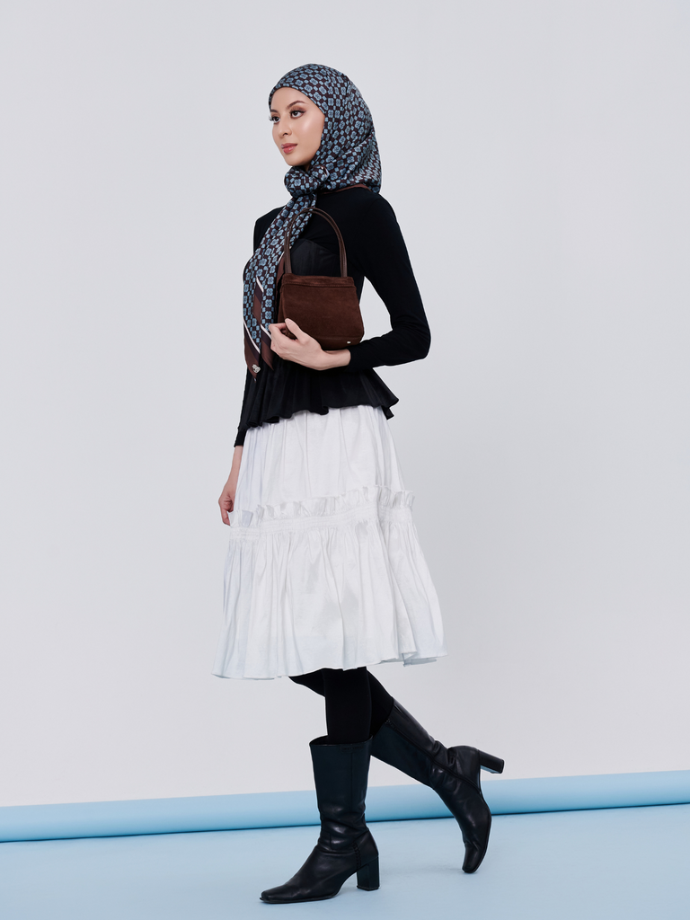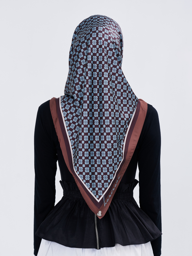 It features delicate teal floral motifs elegantly scattered across a rich, dark brown base. The vibrant design stands out against the deep, earthy backdrop, creating a harmonious contrast that captures attention.