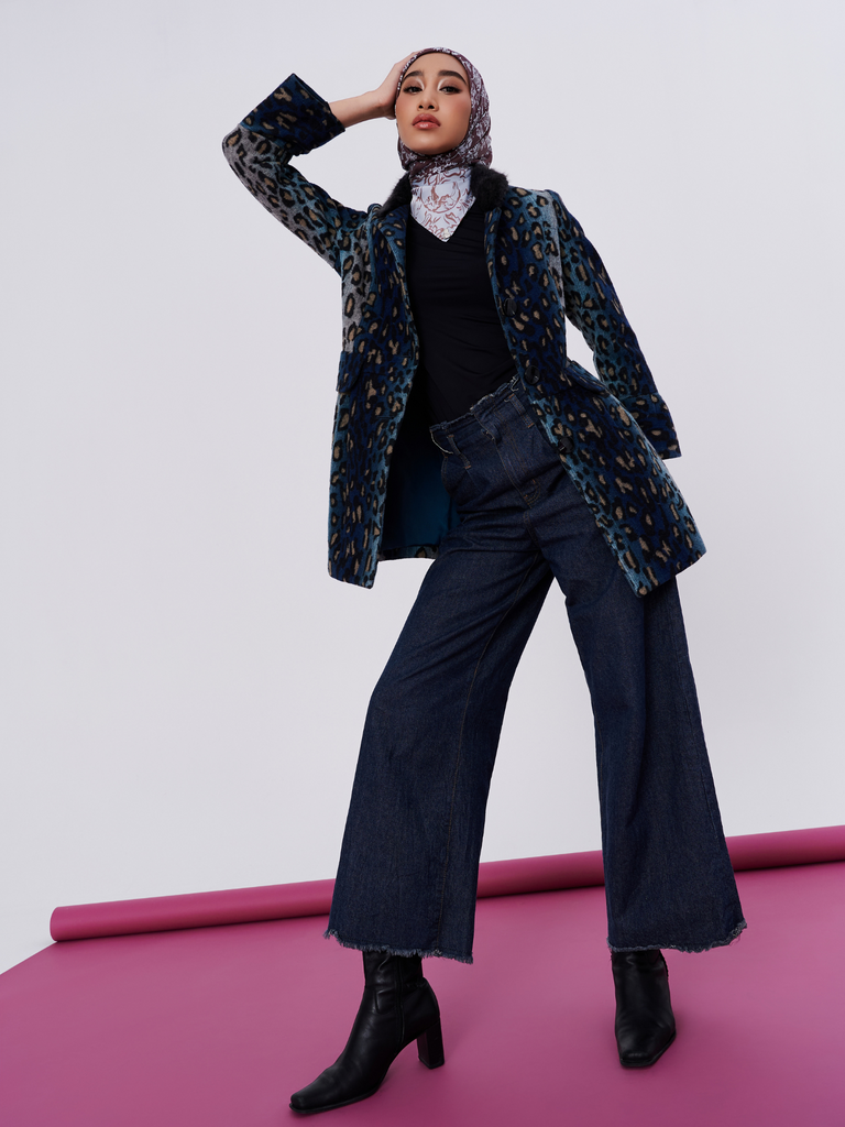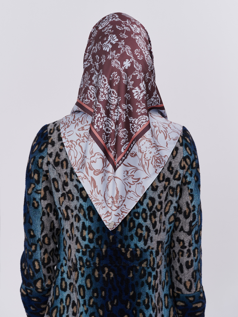 A soft ode to vintage gardens, this scarf features intricate floral motifs arranged like a timeless tapestry. Designed in muted tones and framed by a delicate blue border, it’s a piece that feels both nostalgic and effortlessly chic