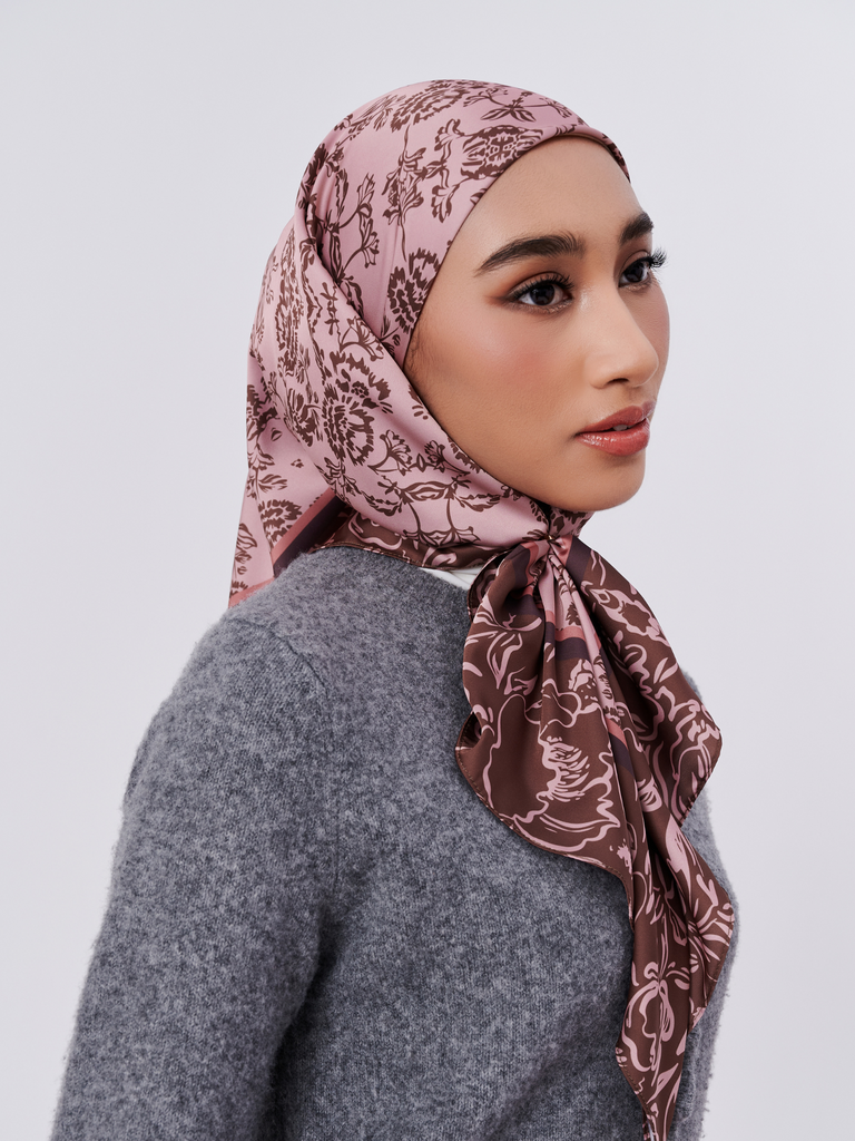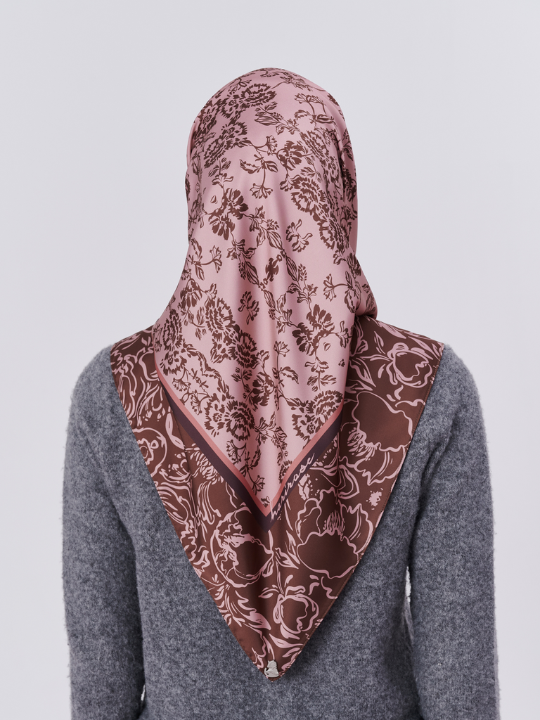 A soft ode to vintage gardens, this scarf features intricate floral motifs arranged like a timeless tapestry. Designed in muted tones and framed by a delicate brown and pink border, it’s a piece that feels both nostalgic and effortlessly chic.