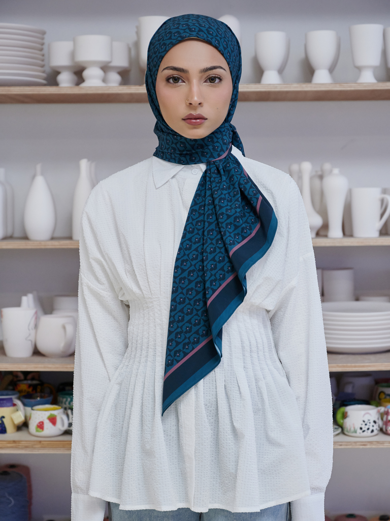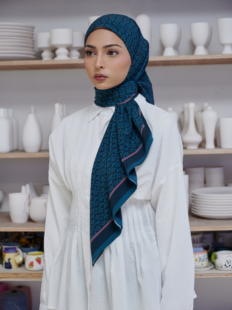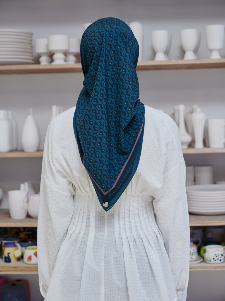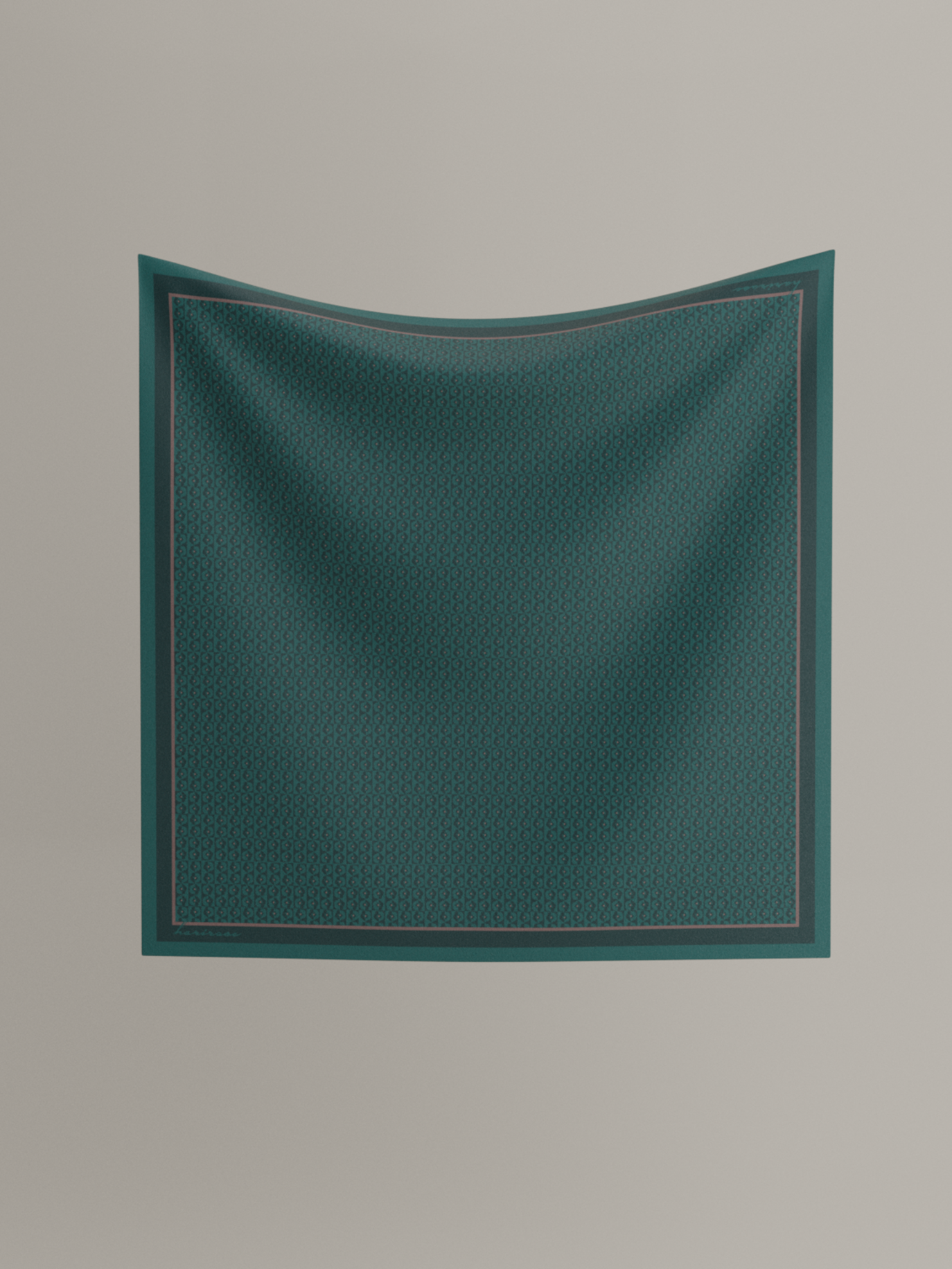 Inspired by monochromatic porcelain designs, this print represents love, admiration and distinction as seen from the floral patterns. A bold dark green that indicates wealth paired with a vivid shade of pink that symbolizes warmth and hope to anyone who wears it.