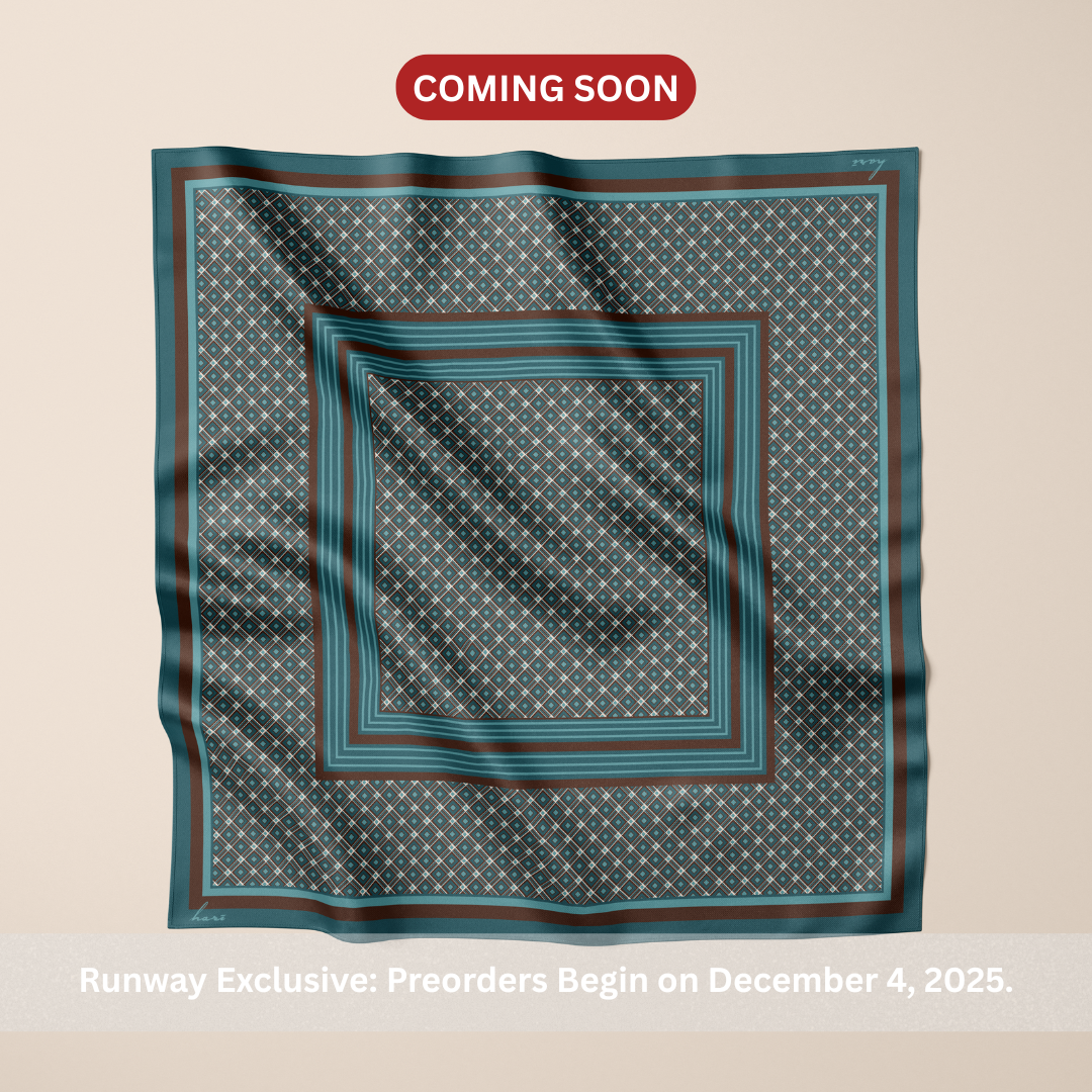 This scarf features a retro-inspired monogram print arranged in a structured grid of repeating motifs. Framed with contrasting borders that echo classic silk squares, the design blends old-world charm with a modern, minimalist sensibility.