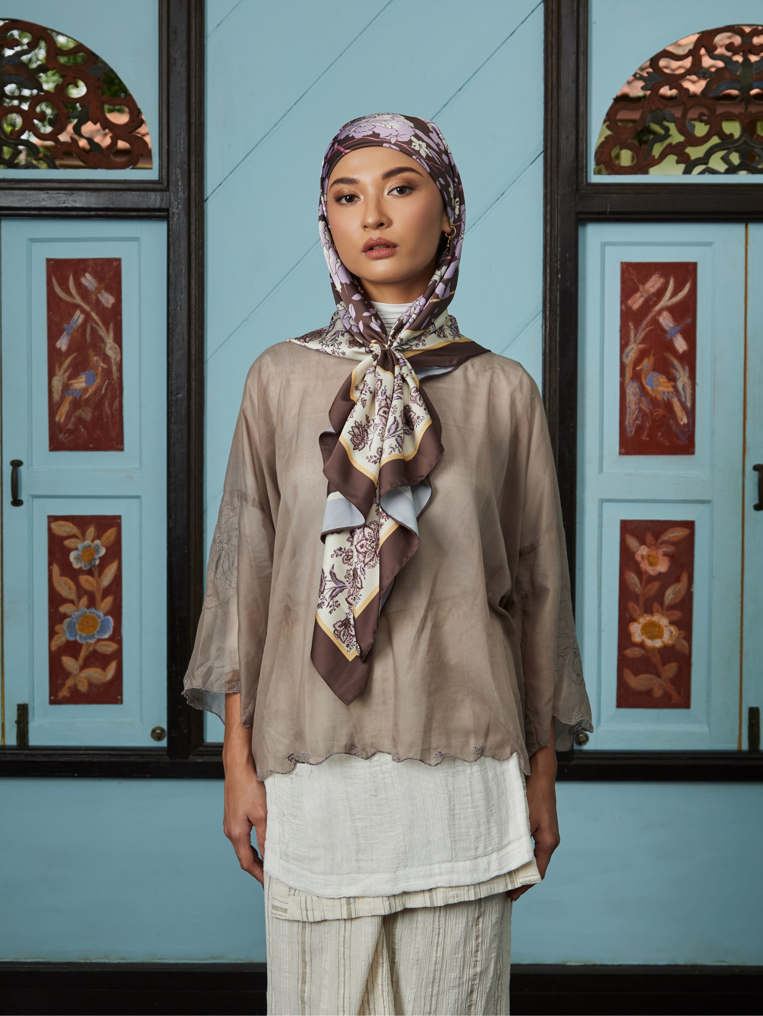 An intricate tapestry of blooming florals framed by ornate borders. The print blends heritage motifs with contemporary refinement, creating a design that feels both timeless and newly reimagined. Versatile enough for everyday styling yet striking enough for special moments.