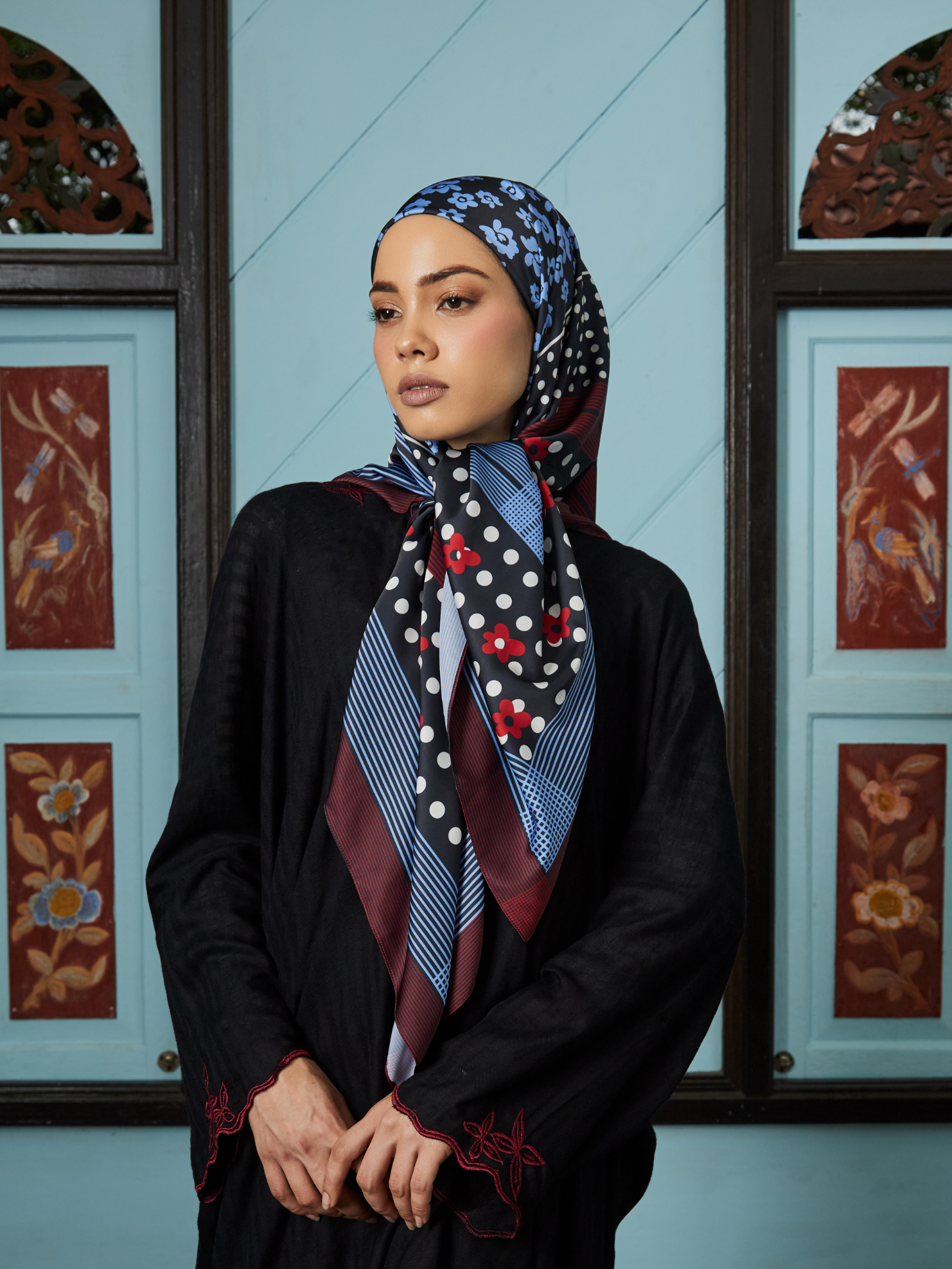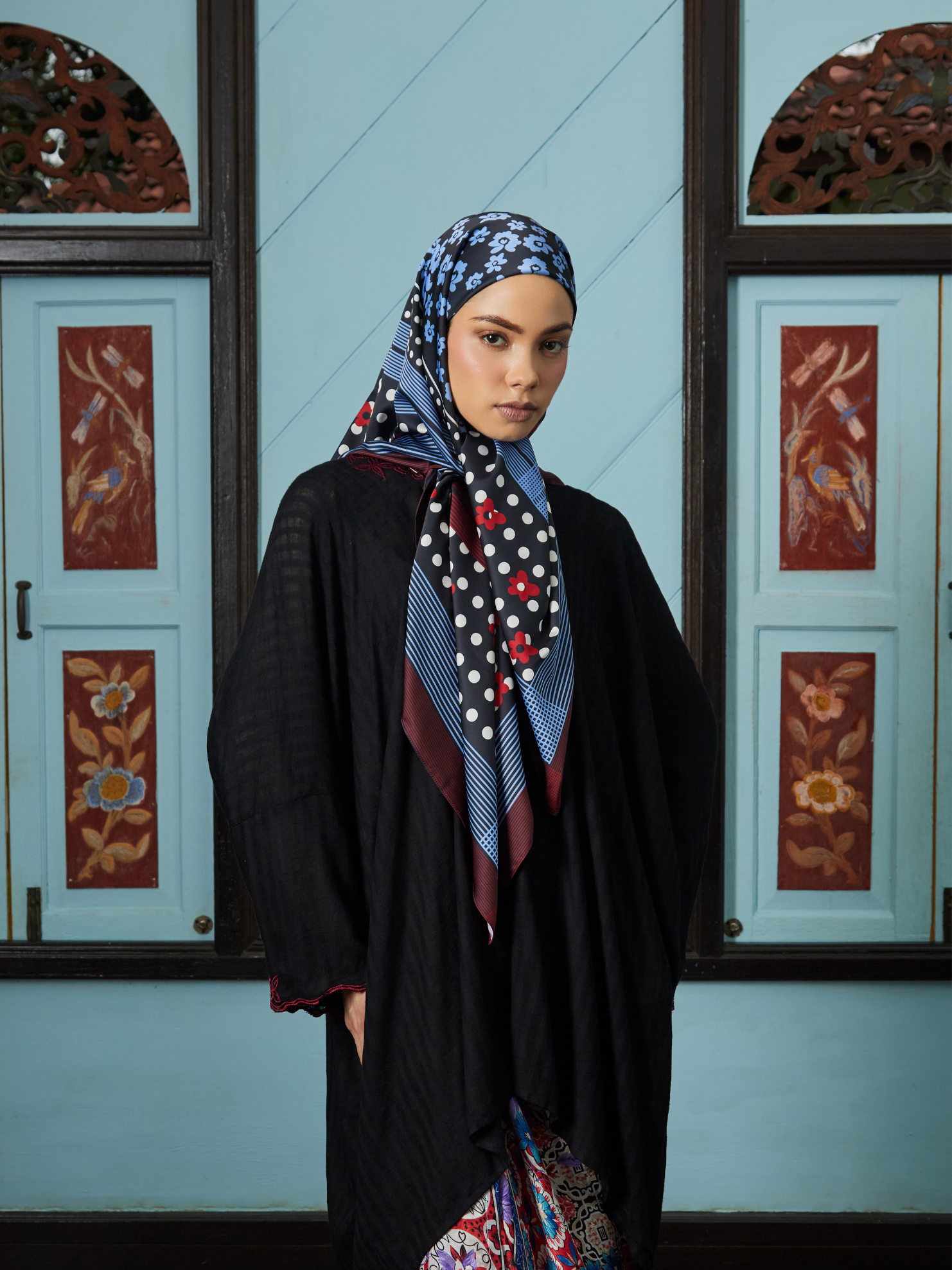 A study in contrast and harmony, this scarf brings together florals, polka dots, and abstract motifs into one cohesive design thoughtfully composed to feel balanced, not busy. Made to elevate everyday looks and add interest to occasion wear, it’s a statement that still feels effortless.