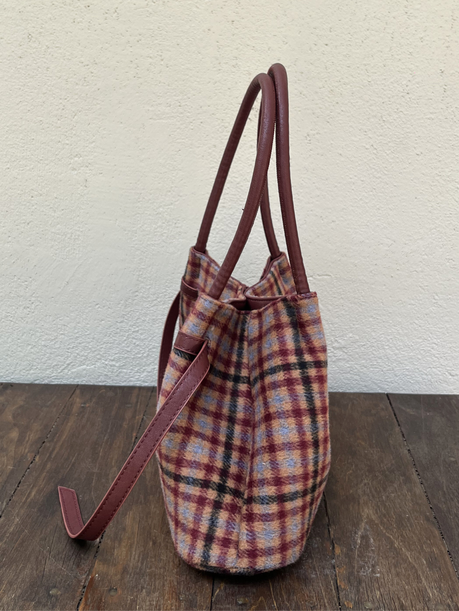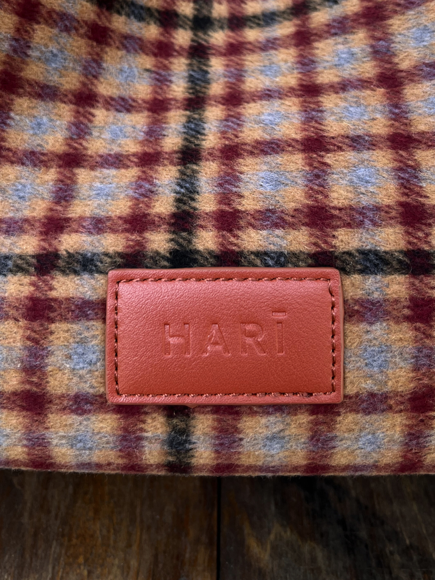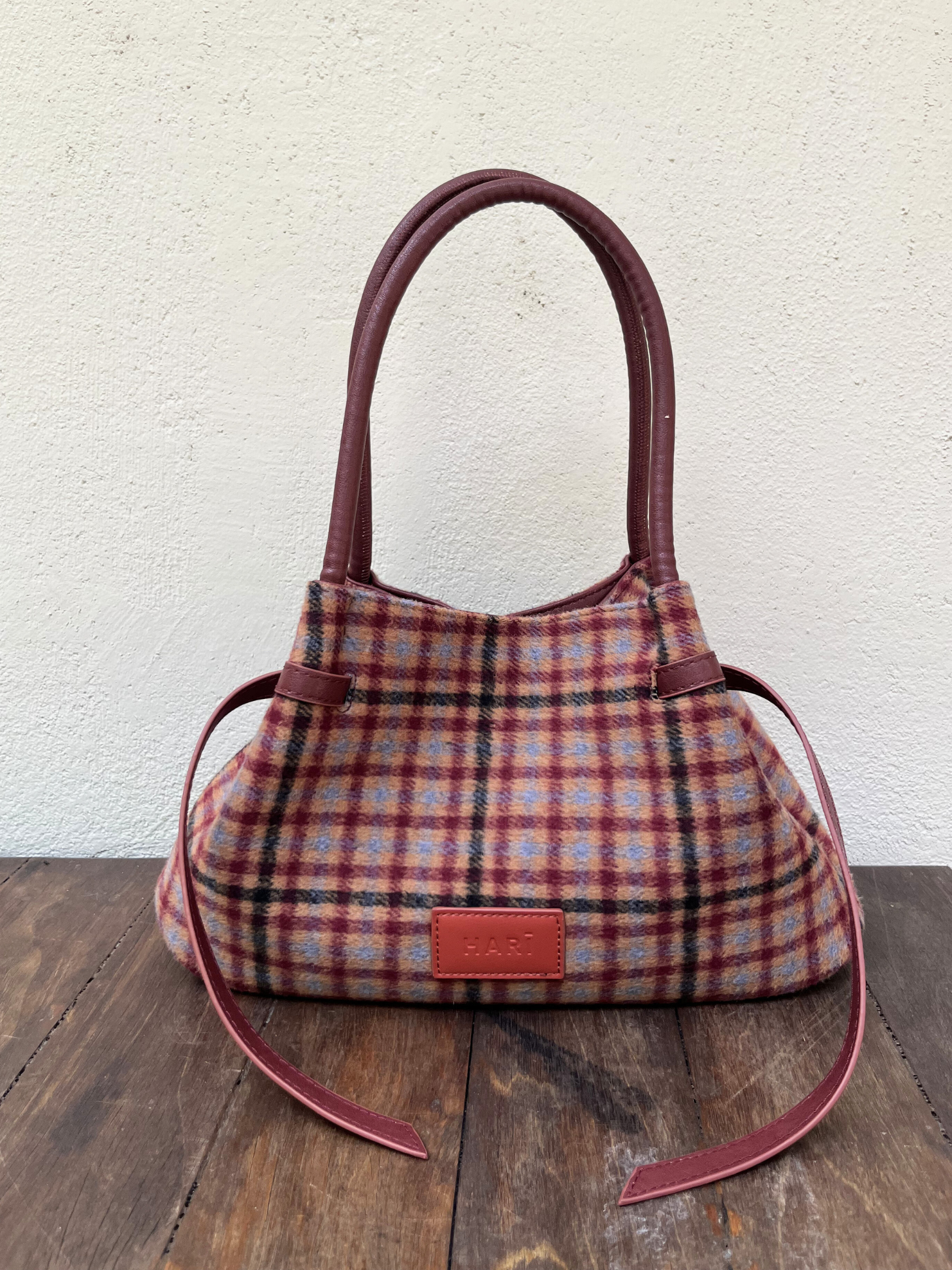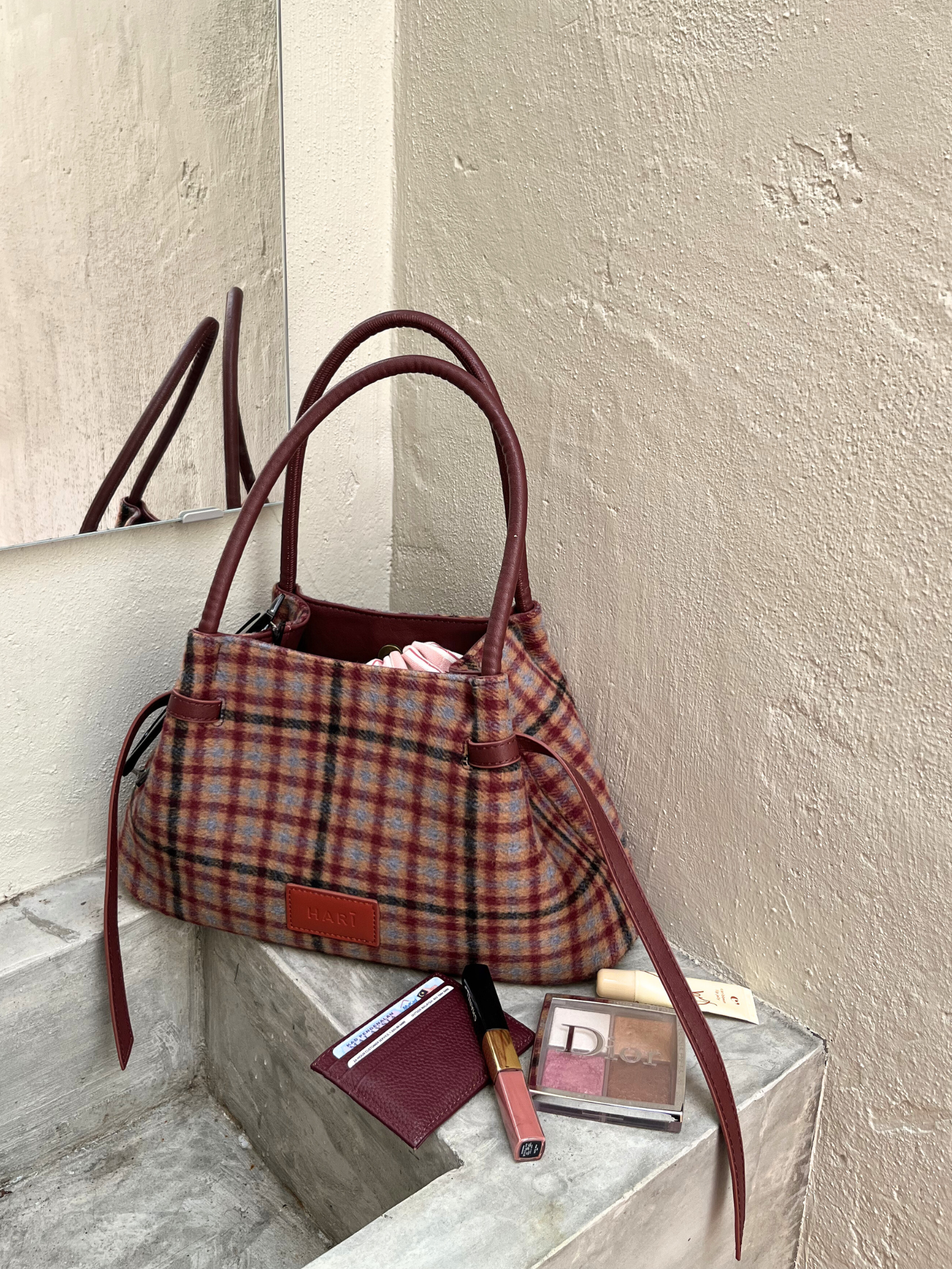 Its plaid base is crafted from soft synthetic fibers, giving the bag a structured yet comfortable feel while highlighting the timeless charm of the pattern. Available in 2 colours, Beetroot and Sencha, each colourway offers a different mood — one bold and eye-catching, the other warm and quietly classic.